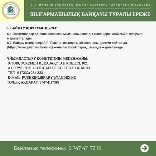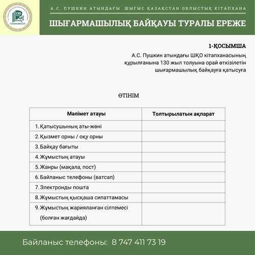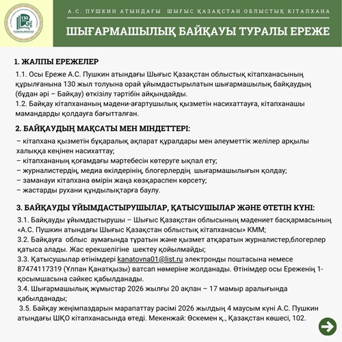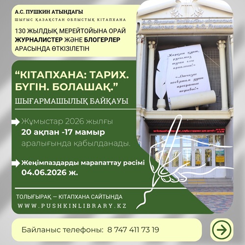 А.С. Пушкин атындағы Шығыс Қазақстан облыстық кітапханасы кітапхананың 130 жылдық мерейтойына орай шығармашылық байқауын жариялайды.
