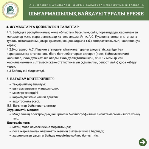 Байқауға республикалық және облыстық басылым, сайт, порталдарда жарияланған мақалалар және жарияланымдар қатыса алады. Яғни, А.С. Пушкин атындағы кітапхана туралы (кітапхананың өмірі, қызметі, жаңашылдығы т.б.) ақпарат жазылып, жариялануы керек. Блогерлер кітапхана туралы әлеуметтік желідегі өз парақшасында кітапхананы бірге белгілей отырып ақпарат (пост, бейнематериал) жариялап, байқауға қатыса алады. Қосымша мәліметтермен Байқау Ережесінен таныса аласыздар.