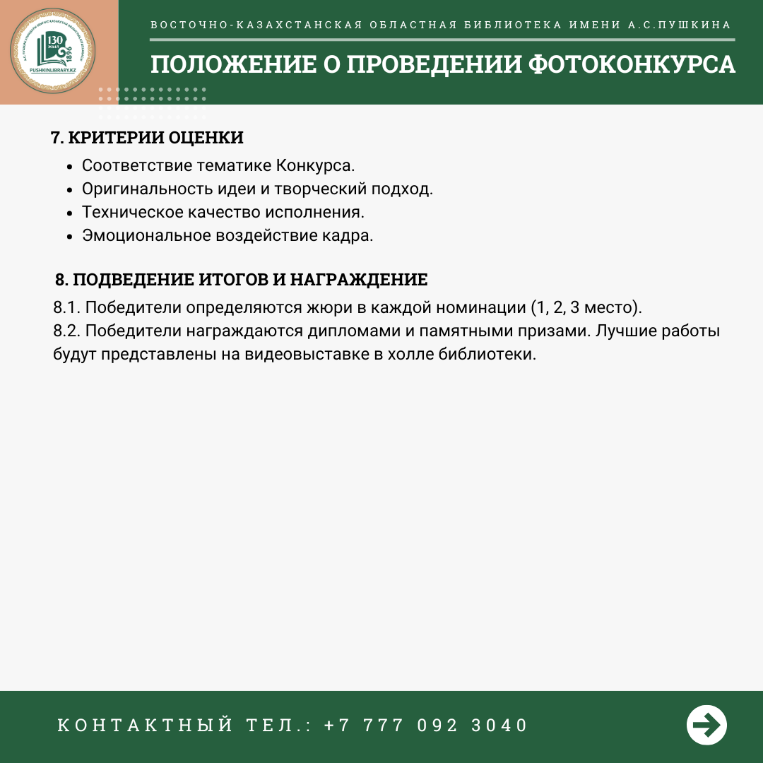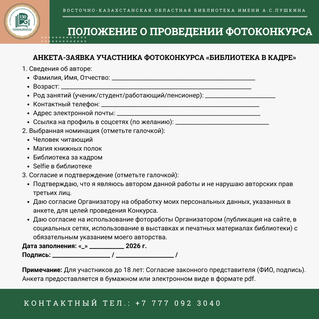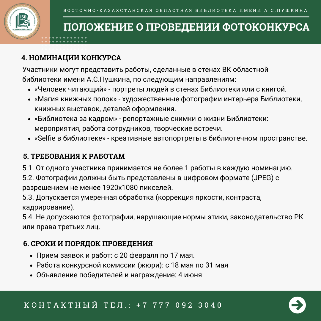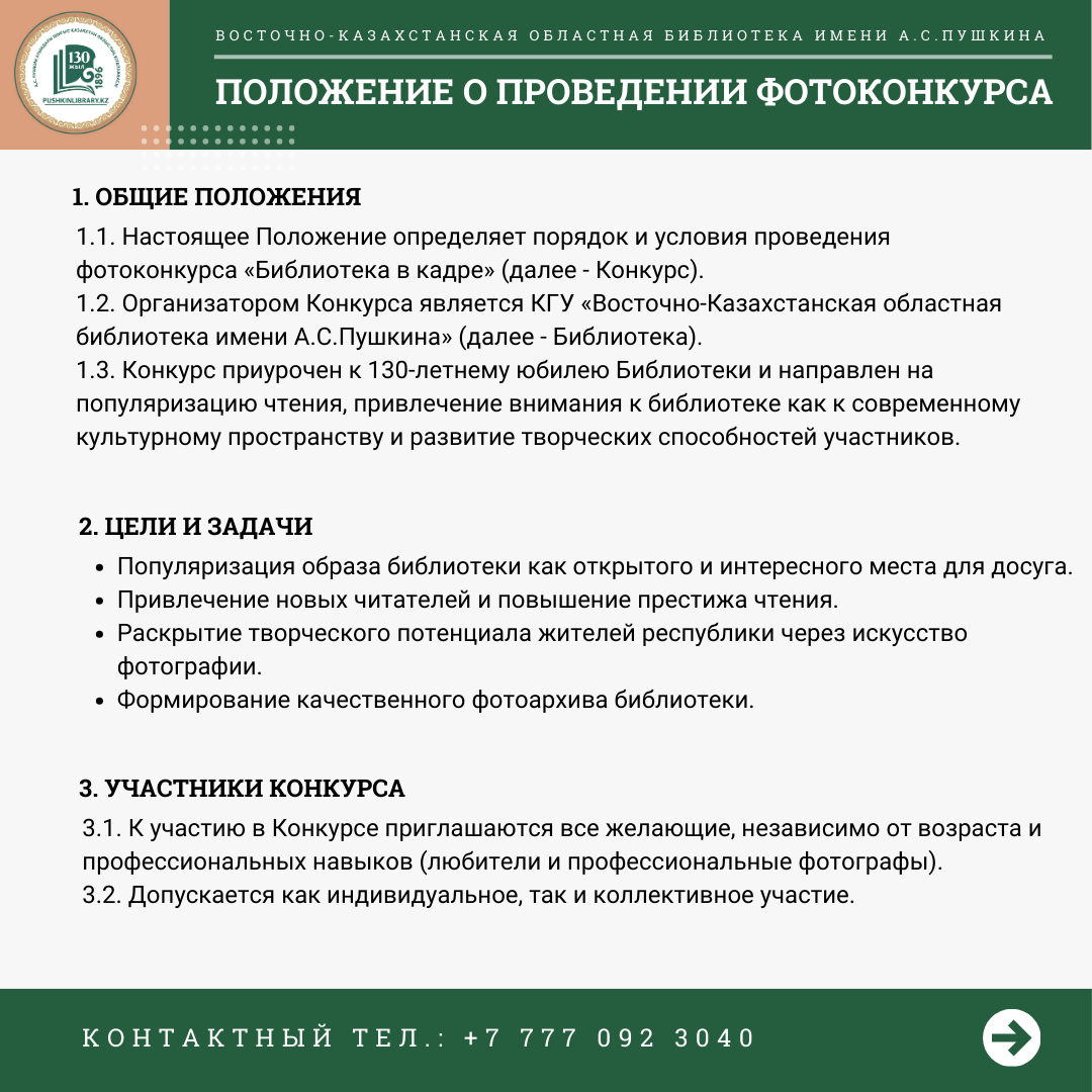 Восточно-Казахстанская областная библиотека имени А.С. Пушкина объявляет о запуске открытого фотоконкурса «Библиотека в кадре». Творческий проект приурочен к знаковой дате - 130-летнему юбилею старейшей библиотеки региона.
