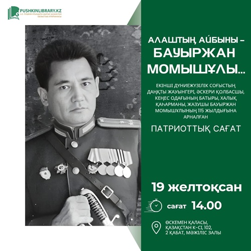 19 желтоқсан күні сағат 14.00-де кітапханада Кеңес одағының батыры, қазақтың көрнекті жазушысы, Екінші дүниежүзілік соғыстың даңқты жауынгері, Халық қаһарманы, әскери қолбасшы Бауыржан Момышұлының 115 жылдығына орай патриоттық іс-шара өтеді.