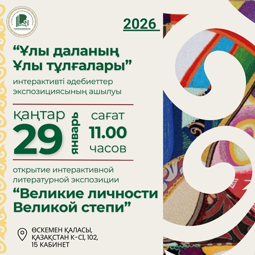 29 қаңтар 2026 жылы сағат 11.00-де А.С. Пушкин атындағы Шығыс Қазақстан облыстық кітапханасында жыл сайын дәстүрлі түрде мерейтойлық және атаулы күндер күнтізбесін ашатын, кітапхананың алдағы барлық іс-шараларына бастау болатын «Ұлы Даланың Ұлы тұлғалары: мерейтойлық энциклопедия – 2026» кітап көрмесінің ашылуы өтеді.