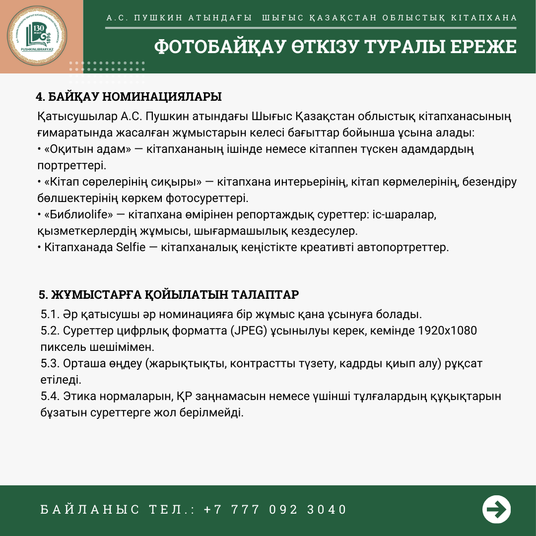 Байқауға жас шектеусіз барлық ниет білдірушілер қатыса алады. Басты талап - фотосуреттер А.С. Пушкин атындағы ШҚ облыстық кітапханасының ішінде түсірілуі тиіс.