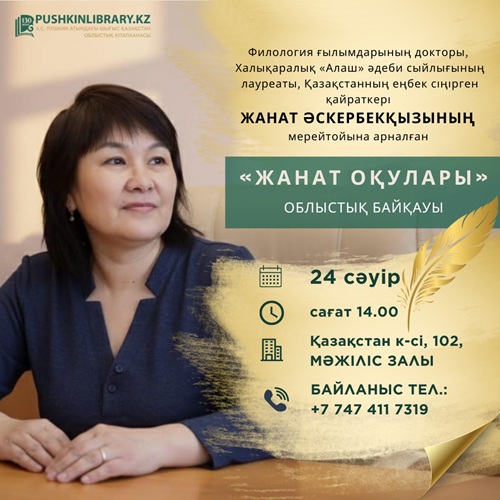 А. С. Пушкин атындағы Шығыс Қазақстан облыстық кітапханасы жерлес ақын, әдебиеттанушы-ғалым, Қазақстанның еңбек сіңірген қайраткері, Халықаралық «Алаш» әдеби сыйлығының лауреаты Жанат Әскербекқызының 60 жылдық мерейтойына орай «Жанат оқулары» байқауын жариялайды.
