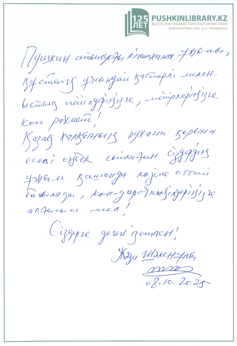 Өскемен қаласының А.С.Пушкин атындағы кітапханасының әкімшілігі мен қызметкерлеріне: сіздер ойды дамытатын әдебиеттерге байсыздар. Бұл үлкен артықшылық. Адамдарға кітап арқылы білім бере отырып, ғанибетке бөлене беріңіздер.