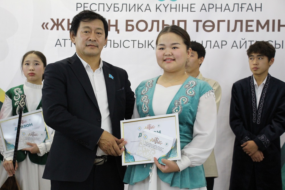 В мероприятии приняли участие учащиеся 5–11 классов общеобразовательных школ районов нашей области и города Усть-Каменогорска. На сцене юные айтыскеры в национальных костюмах и с домброй воспевали дух государственности и любовь к Родине. Состязание оценивали акыны, известные в регионе и по всей республике. Мастерство импровизации и артистизм участников получили высокую оценку. Победители конкурса: