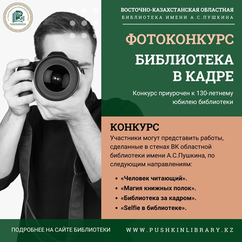 Восточно-Казахстанская областная библиотека имени А.С. Пушкина объявляет о запуске открытого фотоконкурса «Библиотека в кадре». Творческий проект приурочен к знаковой дате - 130-летнему юбилею старейшей библиотеки региона.